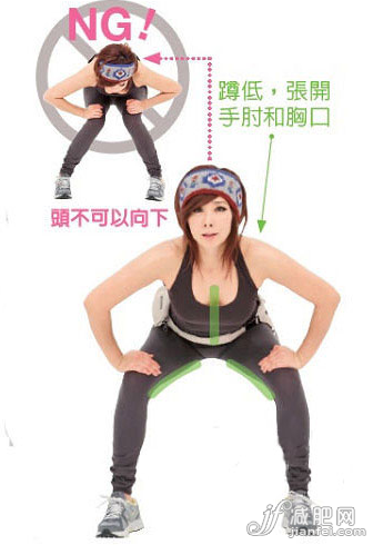 雙腳打開(kāi)稍稍比肩膀?qū)挘ドw彎曲,臀部向后推出,向下蹲低。雙手放在膝蓋上。