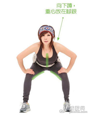 雙腳打開比肩膀?qū)?,膝蓋彎曲,臀部向后推出,腰部盡量向下。雙手放在膝蓋上。