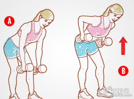 站立,兩腳距離與肩膀同寬,膝蓋稍稍彎曲,臀部稍微向后傾,兩只手分別持兩只啞鈴,垂在膝蓋兩側(cè)(如圖a)。快速把啞鈴提舉到胸前,注意手肘盡量靠近身體兩側(cè),同時擠壓你的肩胛骨(如圖b)。慢慢地把啞鈴垂下到達初始位置。重復(fù)10次。