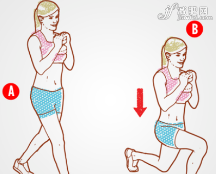 站立,右腳在左腳前,兩手持一只啞鈴在胸前,讓啞鈴呈垂直狀(如圖a)。收緊腹肌保持平衡,左膝蓋和右膝蓋分別曲起呈90度角(如圖b)?;氐狡鹗嘉恢茫貜?fù)10次,然后再換左腳在前右腳在后,再重復(fù)10次。