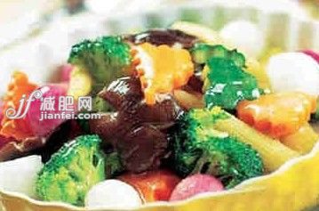 3、鍋熱倒入花生適量,油熱后放入蔥花、姜末煸炒,再下冬菇、冬筍、胡蘿卡煸炒一下,后下油菜、面筋、腐竹、蛋皮、木耳,加適量清湯,加入精鹽、白糖、醬油、味精適量,翻炒均勻,盛出裝盤即可。