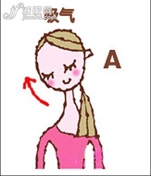 動作2:A 頭部向前方傾斜,然后將頭部向右側(cè)轉(zhuǎn)動,同時吸氣。