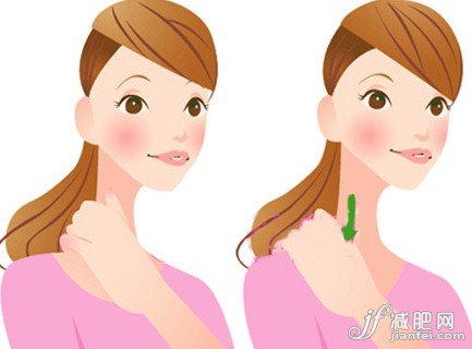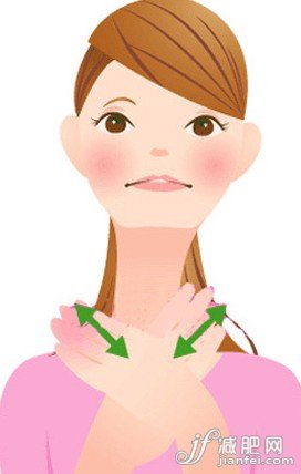 5、雙手手掌在左右鎖骨之間的中央位置較差,分別沿著鎖骨向外輕擦,按摩時注意抬起頭,令鎖骨周圍的肌肉緊張起來。