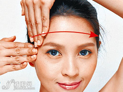 Step7:重復(fù)步驟5,換左手停右耳前,右手指朝下滑推過(guò)額頭按摩一次。