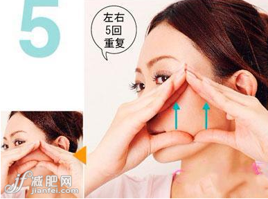 兩手四指并攏,兩手形成一個金字塔狀掐住臉頰,然后兩拇指向上推按,每邊重復5次。