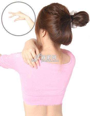 抬起左手手臂往前水平方向伸出,然后右手放在左邊肩部以下的背上,用食指、中指及無名指指腹稍作用力按摩后肩(手勢如上圖左上角小圖所示),動作持續(xù)15秒,然后換邊重復(fù)動作。