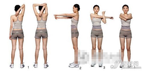 兩手臂交叉后使手摸到反方向的肩膀后面的部位,雙手使勁并以擁抱的姿勢拉動肩膀,維持5秒鐘,如此反復5次。這樣可以使平時不常用的肌肉得到放松并幫助血液循環(huán)。