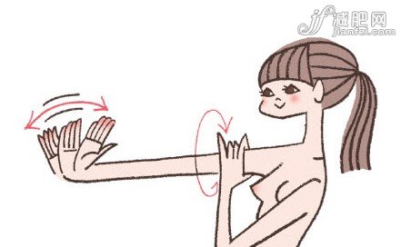 1、右臂向前伸直,手掌打開翹起,手指并攏,掌心向前。左手扶在右手的上臂上,然后右手手腕向左右擺動的同時(shí),左手向上下的方向輕輕擰動右手上臂。