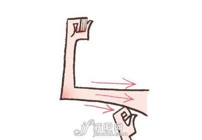 2、伸出右手手臂,手肘彎曲,上臂與下臂成90度直角,右手向內(nèi)握拳。左手握拳,用手指的第二關(guān)鍵,從手肘到腋下,按摩右手的上臂。