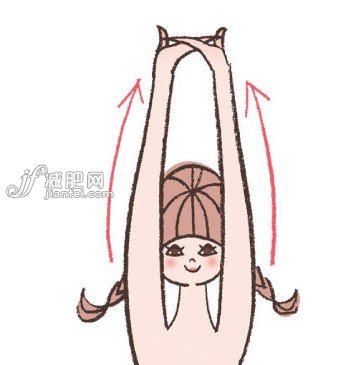 4、雙手手掌向外,手指相互交叉,然后手臂向上伸直舉起,手掌向上壓,停留10秒,拉伸整個(gè)手臂的肌肉。