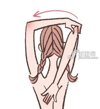 5、右手手臂向身后彎曲,手掌貼著肩胛骨,左手手肘彎曲,下臂從上繞過頭部,用手扶著右手手肘,然后慢慢向左壓10秒。
