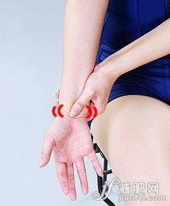 3、拇指按摩至手腕處時(shí),右手手掌打開(kāi),手指自然張開(kāi),用左手拇指的指腹一下一下地按壓。然后回到手肘窩上,再次按摩前臂,重復(fù)3次。