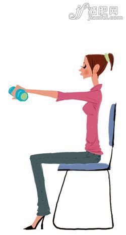 身體坐在椅子上,背脊挺直,挺胸收腹,注意背部不要靠著椅背。呼氣時(shí)慢慢抬高雙手,與身體呈水平后停頓1~2秒,吸氣的同時(shí)慢慢放下到膝蓋的位置。這個(gè)動(dòng)作可以起到有效燃燒大臂上脂肪的作用。