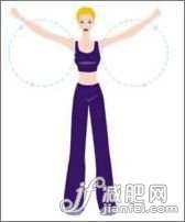 2.身體站直,雙腳打開約與肩同寬,手臂向兩旁打開伸平,慢慢地向后劃圈。此乃著重于 緊實(shí)手臂內(nèi)側(cè),以及胸部的肌肉。