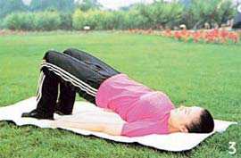 3、提臀運動。仰面躺在墊子上,雙手放在身側,膝蓋彎曲,腳著地。抬起臀部,只讓肩和腳與地面接觸。重復10次。(這個動作也可以鍛煉你的臀部肌肉。)