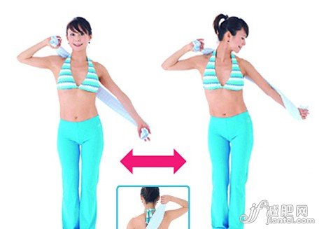 3、原本收起的右手肘向右側(cè)打開,后臂平舉起,與地面平行,左臂也伸直。毛巾向右上、坐下拉動,類似搓澡的姿勢。