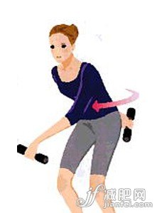 身體前傾,雙腿彎曲,左手拿著啞鈴(空出右手),掌心朝內(nèi),放在大腿前方。然后右手接過(guò)啞鈴,繞到身后,手握啞鈴置于左邊腰側(cè),左手接過(guò)啞鈴,重復(fù)動(dòng)作。約20-30回,繞的方向可左右交替,各做10回。