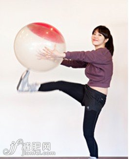 1、拿一個(gè)健身球放在離身體約10cm的右邊的位置,雙腳微微張開站立,身體挺直,然后上身往右邊下彎,用按住健身球,動(dòng)作持續(xù)20秒,然后換邊重復(fù)動(dòng)作。