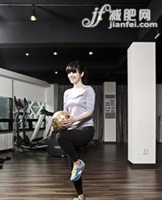 1、雙腳并攏,身體挺直站立,然后左腿曲膝抬起至臀部高度,右腿保持直立狀態(tài),雙手彎曲手肘拿著健身球放在左腿的膝蓋上,動(dòng)作持續(xù)15秒。