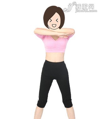 1、張開雙腿約40cm,身體挺直站立,保持收腹動作,然后彎曲雙手手肘抬起至肩膀高度,右手疊放在左手手臂上,眼睛看著前方,動作持續(xù)20秒。