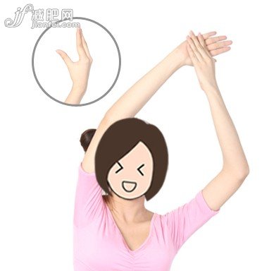 4、均勻吸氣,然后伸直右手手臂抬起至偏左邊位置,再彎曲左手手肘抬起左手,左手五指并攏張開,左手手掌放在右手手掌掌心上,按摩小拇指根部15秒(手勢(shì)如上圖左上角小圖所示),,再換邊重復(fù)動(dòng)作。