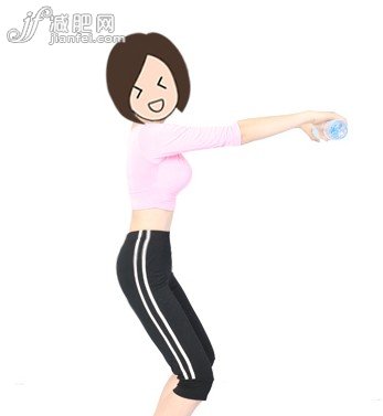 10、往前邁出左腿呈弓步狀,右腿往后微微曲膝伸出,雙腳腳掌均著地,雙手分別拿著一個瓶子,手臂往左右方向伸直,掌心向下,動作持續(xù)20秒。
