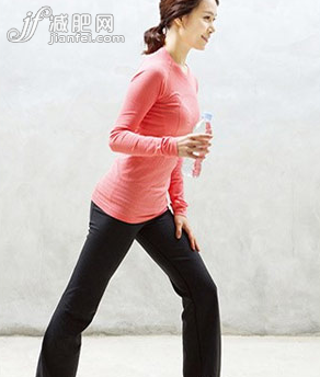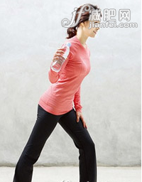 1. 左腿往前伸,膝蓋彎曲,右腿向后伸直。右手握水瓶,胳膊肘彎曲90度,手背朝外,胳膊肘正好在身體正側面。