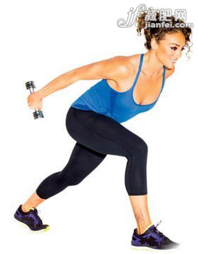 雙腳一前一后站立,左腳在前的時(shí)候右腳腳跟離地,雙臂放在身體兩側(cè),然后雙手各握一個(gè)啞鈴,彎曲手中將啞鈴舉向胸前的位置,然后彎曲左腿膝蓋,身體稍微向前傾斜。保持這個(gè)姿勢(shì),案后將手臂向后伸直,停留一分鐘后復(fù)原,重復(fù)十二次,中間六次交換雙腿。
