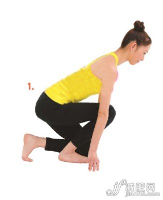 Step 3:1、雙膝彎曲,左膝跪地,同時(shí)用腳趾撐地,有腳腳掌踩地,大腿與地面平衡,上身向前傾出,腰背保持挺直,同時(shí)手臂伸直,用手指撐在地上。