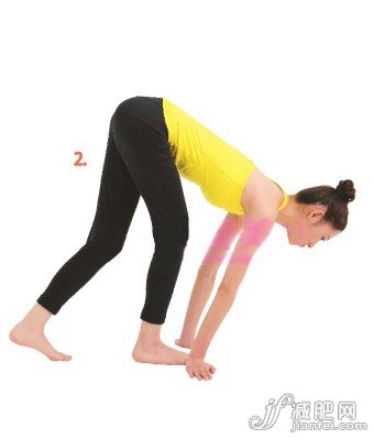 2、雙腿慢慢打開角度,膝蓋舒展開,保持微微的彎曲狀態(tài),抬起臀部,上身進(jìn)一步俯下,雙臂保持伸直,手掌完全著地,但左腳跟始終離地。