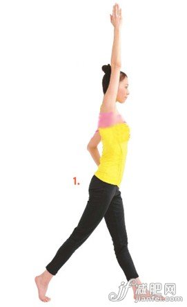 Step 5:1、左手叉腰,右臂伸直往正上方舉高,手掌繃直,指尖指向上方。右腿向后邁出一步,用腳趾著地,雙腿繃直,重心落在雙腳之間。