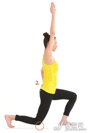 2、然后臀部下沉,雙膝彎曲,右膝跪地,左側(cè)大腿與地面平衡,保持上身挺直,右臂舉高,左右叉腰的姿勢。