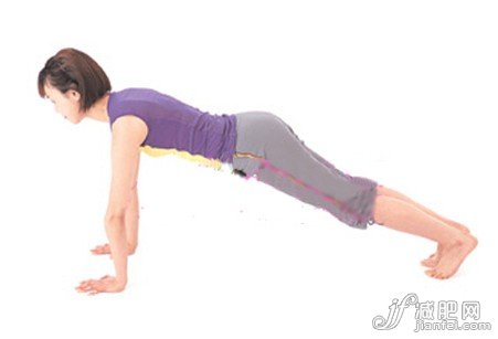 2、雙手撐直,兩腿依次向后伸展,同樣用腳趾著地,雙膝繃直,大腿、小腿與上身連成直線,注意上身不要后仰,臀部不要下沉,頭微微抬起。重復(fù)伸直與收攏兩個(gè)動(dòng)作各3次。