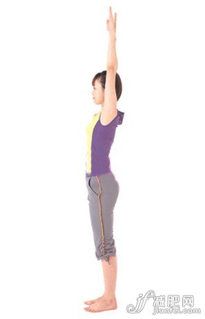3、恢復(fù)腳趾撐地蹲的姿勢后,腳掌完全著地,身體向上拉起,大腿與小腿伸展開,全身站直,并且雙臂往上舉高,手掌向前。