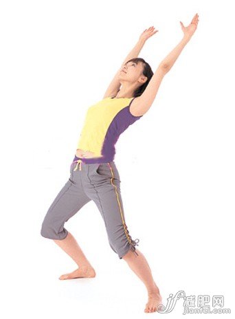 4、兩臂保持高舉的姿勢,右腿向右側(cè)大大地跨出一步,步幅大概是肩寬的2倍,雙膝微微彎曲,同時上身向后仰,頭往上仰起,雙臂隨著上身往斜后方伸展。