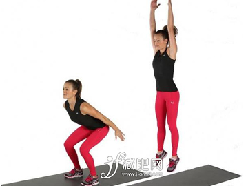 雙腳分開,彎曲膝蓋,下壓臀部,上身和手臂都伸直;雙臂向上伸起,同時用力起跳,落地后恢復(fù)蹲姿,12個為一組,中間休息1分鐘,共做3組。