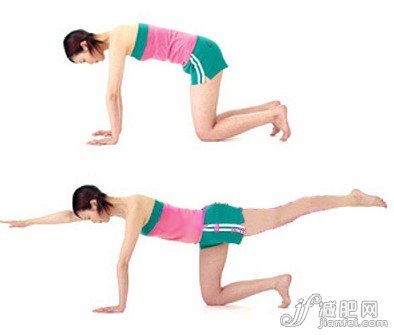 骨盆矯正減肥操:1、雙膝跪地,兩腿間空出一個拳頭的距離,腳掌向后,用腳趾撐地,上身水平拉直,雙臂伸直撐地,頭往下看。右臂與左腿同時往前后伸展平舉,保持3秒后,放下,換左臂右腿平舉。