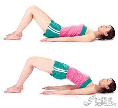 2、雙腿屈膝躺臥,雙臂伸直放于上身兩側(cè),大腿與小腿成90度。雙臂臀部上抬,令臀部、腰背慢慢離地,并與大腿連成直線,兩肩、頭部、雙臂和腳掌著地支撐身體。