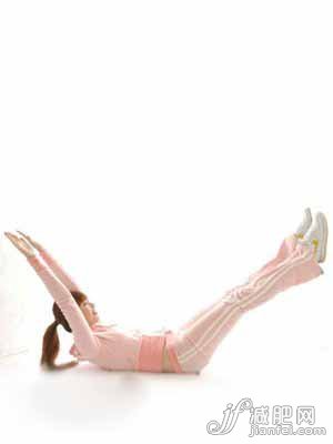 仰臥后,頭微抬起,兩臂伸直,兩腿屈膝,用指尖去碰觸小腿。深吸氣。