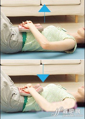 STEP 1 腹式呼吸。雙膝彎曲躺臥于地上,將兩三本雜志放在腹部上,雙手扶在上面,然后慢慢吸氣,感覺到空氣進(jìn)入體內(nèi)而令腹部膨脹,注意腰背不要離地。然后慢慢呼氣,腹部上的雜志緩緩下沉,腹部凹下。這樣重復(fù)深呼吸數(shù)次,來練習(xí)腹式呼吸。