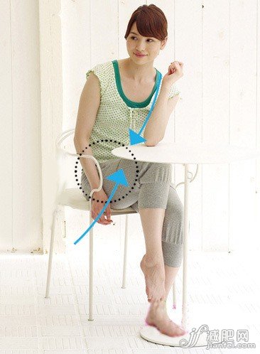 1、坐在桌前,注意與桌子的距離,并攏的雙腿放在桌面下。然后左臂彎曲,下臂與上臂靠攏,手肘壓在桌面上,右臂自然垂下。