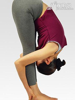 站姿,雙腳并攏,雙腿伸直,身體向下彎曲,直至雙手觸到腳跟,前臂緊貼小腿后方,額頭置于小腿面,臀部向上抬起,盡量使腹部緊貼大腿面。
