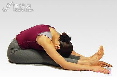 坐姿,雙腿伸直置于身體前方,腳面繃直,身體向下彎曲,額頭置于小腿上,肩膀向上拱起,腹部緊貼大腿面,雙臂順勢置于雙腿兩側(cè),手掌著地。