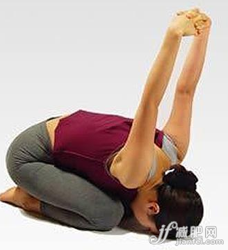 跪姿,雙腳并攏,腳面繃直,臀部坐在腳跟上,身體向下彎曲,使腹部緊貼大腿面,額頭置于地板上,雙臂伸直置于背后,雙手手指互勾。