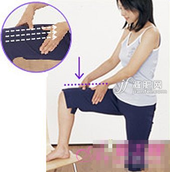 站立在椅子旁,其中一腿成直角彎曲,踏在椅子上,用雙手的拇指按大腿刺激一下淋巴。同樣也是每邊大腿分7-8次完成,從膝蓋往大腿根每下按1秒。