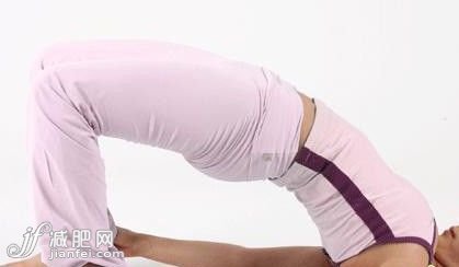仰臥,屈膝,調(diào)整兩腳位置,距離與臀部同寬,臀部抬起,身體離地,兩手握住腳踝,維持姿勢呼吸3次。