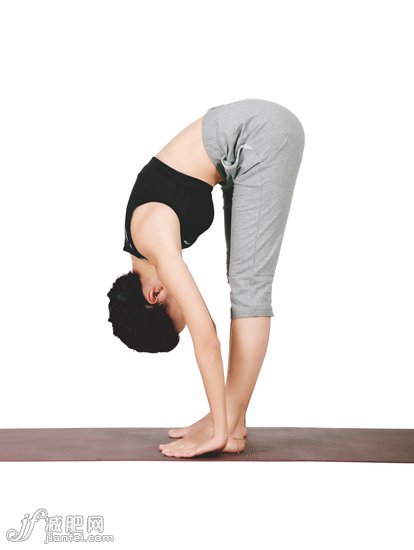 2. 從髖關(guān)節(jié)對折身體,讓下腹部和肋骨大腿貼近,再收下巴拉長頸部后側(cè),兩手至于腳掌旁,手肘朝向后方。