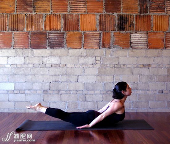 •俯身平趴于墊上,雙腿并攏,雙手放松放在身側(cè),手掌向上。吸氣,向上抬起你的腿部和頭部以及上半 身。雙手支撐與身側(cè)。