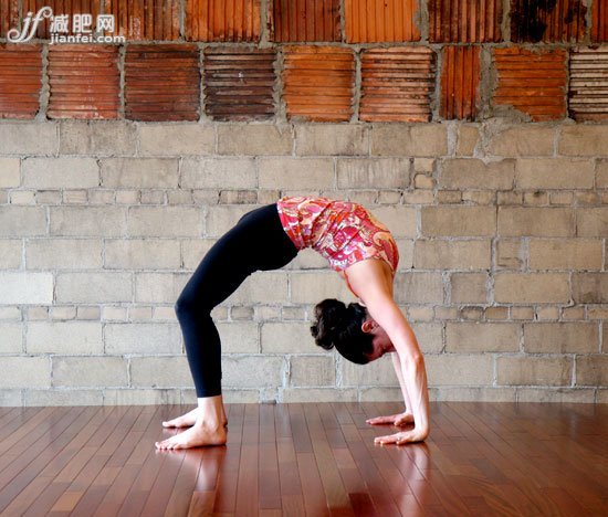•吸氣,雙手用力退地,抬起頭、肩部和臀部。保持這個(gè)輪式姿勢(shì),深呼吸5次。