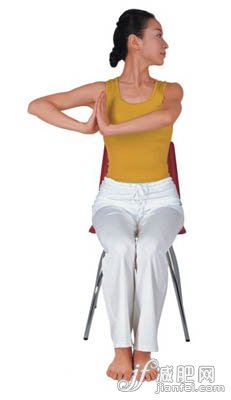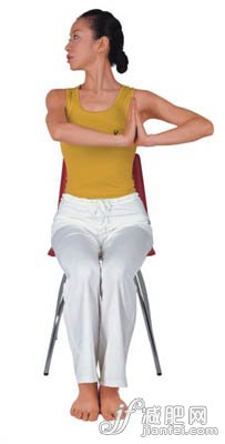 3、吐氣,頭扭向右邊,肩膀保持不動(dòng)。合在胸前的雙手保持用力推,并向左伸展。